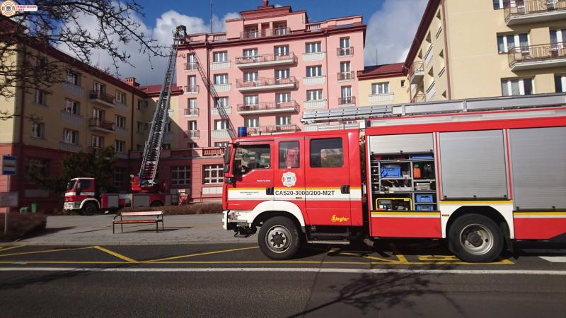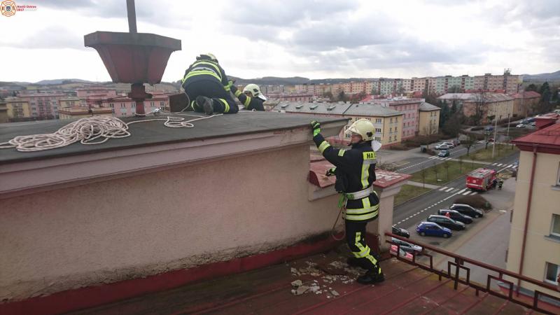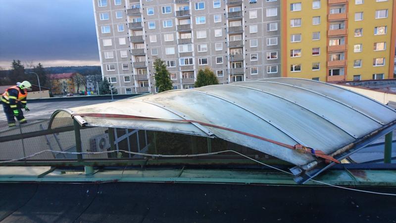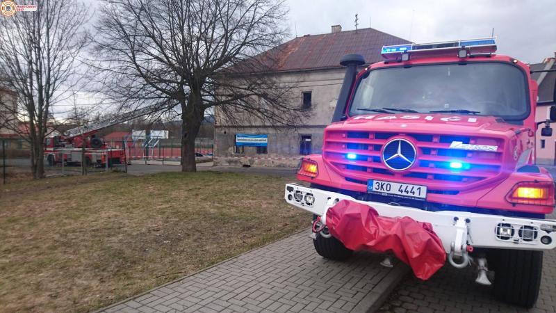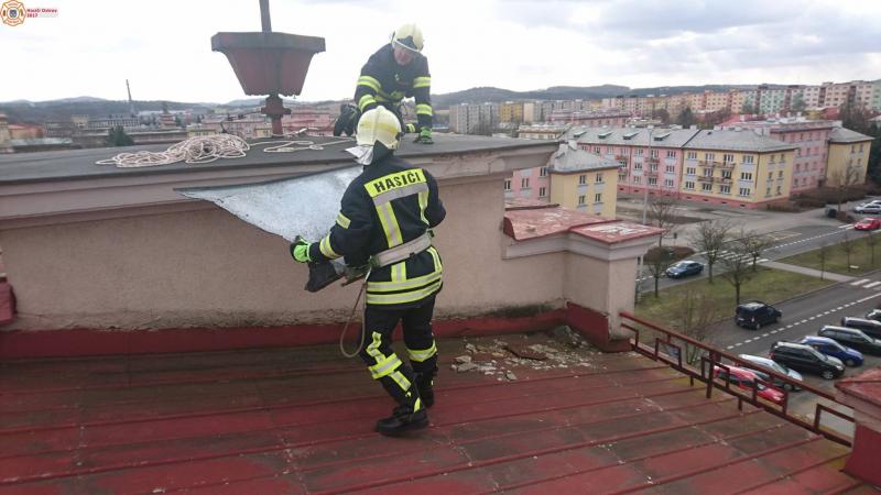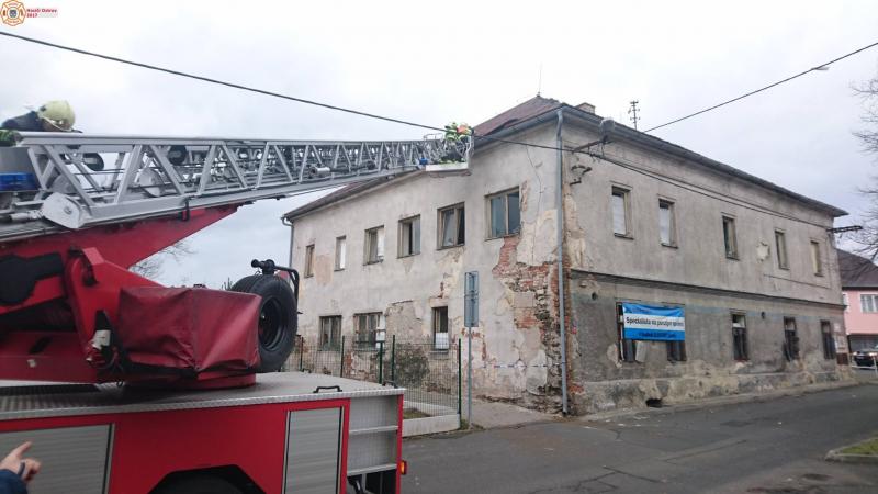 TP/ODSTRANĚNÍ NEBEZPEČÍ: Ostrov, Hroznětínská ul. - Jednotka vyjela s CAS-20 MB Zetros k zajištění uvolněné střešní krytiny na střeše budovy. Na místo byla po ukončení zásahu v ul. Hlavní třída přeposlána jednotka HZS Karlovy Vary s AŽ-37 Iveco.