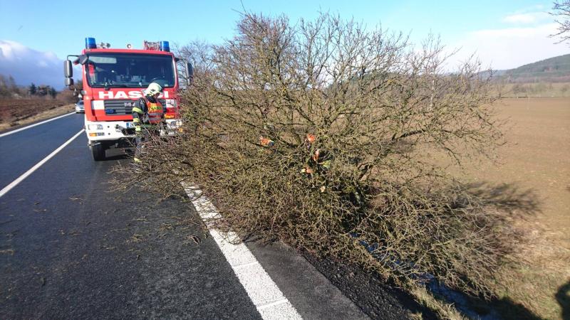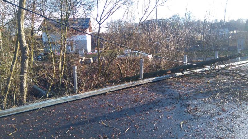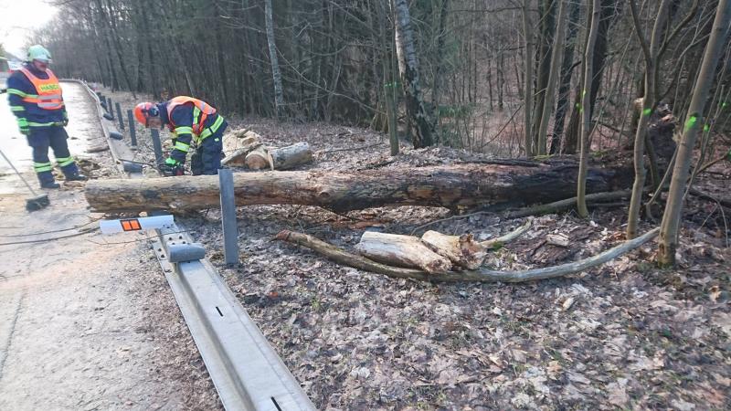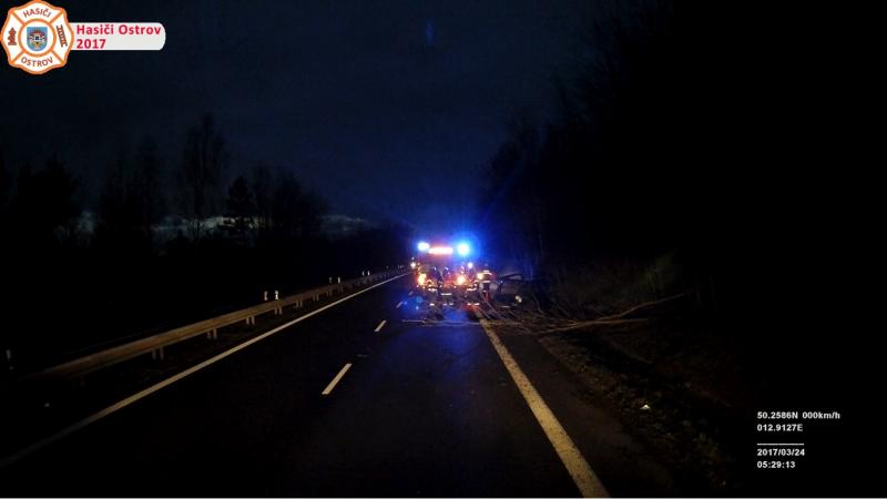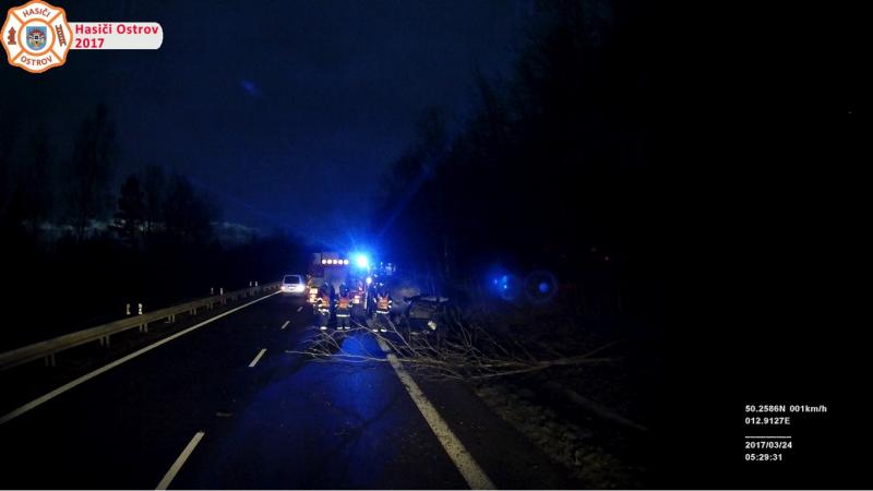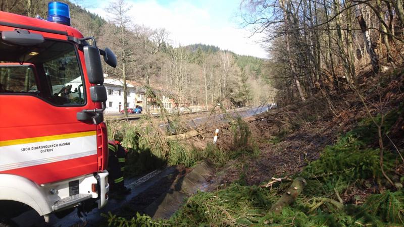 TP/STROM: Ostrov, st.sil.č.1/13 - Jednotka přejížděla z předchozího výjezdu s CAS-20 MAN k odstranění padlých stromů přes svodidla silnice.